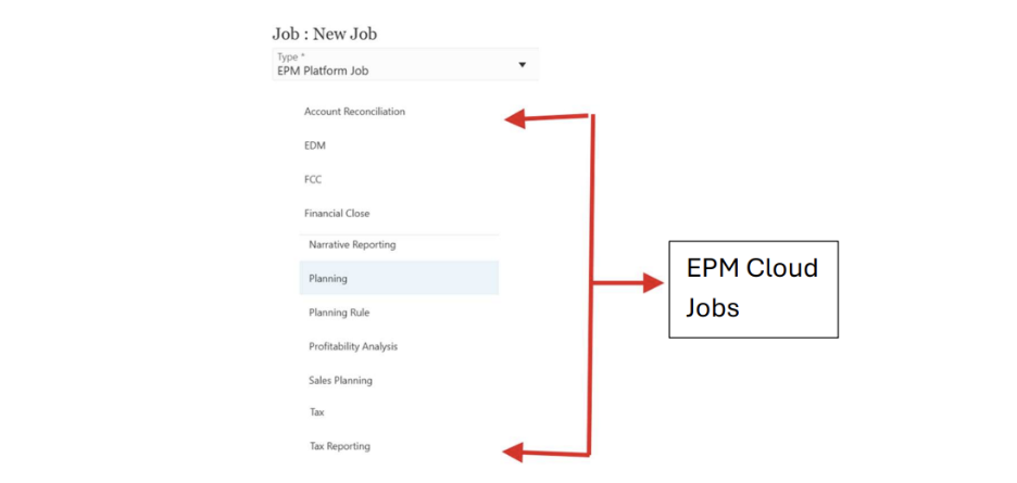 • Supports various Oracle EPM Cloud jobs: Pipeline allows for arranging jobs across various Oracle EPM Cloud solutions like Financial Consolidation and Close, Enterprise Profitability and Cost Management, Planning, Planning Modules, and Tax Reporting. You can arrange jobs to run in a defined sequence or simultaneously within the Pipeline stages. Using EPM Platform job type it allows you to run different EPM cloud jobs.