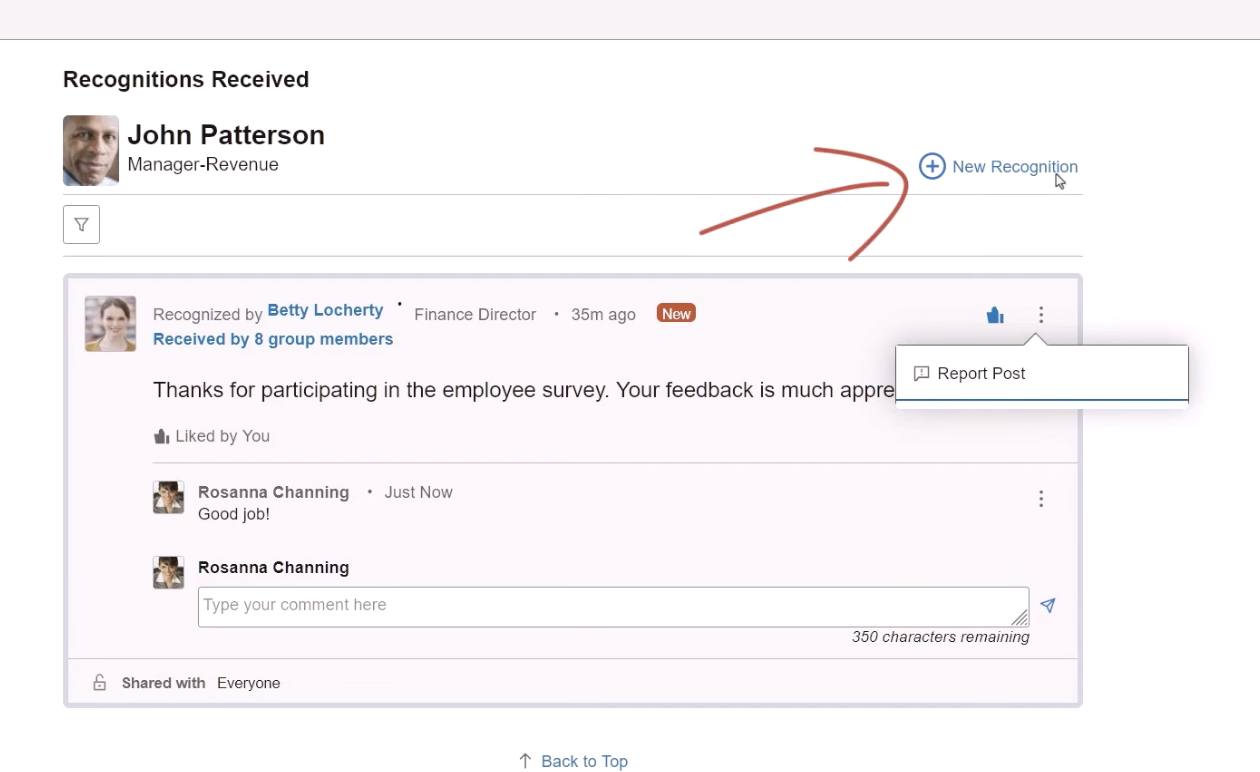 When adding a new recognition from an employee’s page, the system pre-populates that employee as the recipient. Enter what you want to tell the employee, who can see it, and whether viewers can enter comments. You can also create group recognitions by adding multiple people to the recipients list.