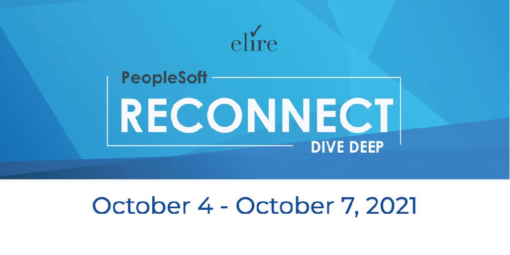 Join Elire at the online global event of the year: PeopleSoft RECONNECT Dive Deep. This 4-day long event from Quest Oracle Community will take place October 4th-7th, 2021 and will include more than 150 sessions.