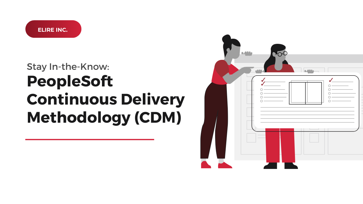 Oracle’s PeopleSoft Continuous Delivery Methodology is made to make your life easier. CDM’s fast paced application enhancement and frequent update schedule ensures your organization doesn’t fall behind. CDM strategies help protect you from risk, save you time and money, and efficiently manage your PeopleSoft environment. To learn more about how Elire’s PeopleSoft experts can help you, take a look at Elire’s PeopleSoft Services page, or contact PeopleSoft@Elire.com with questions.
