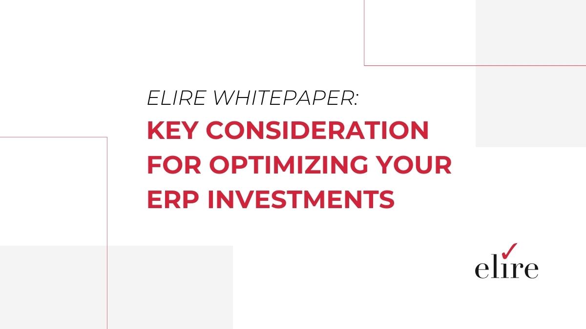 Thank you for your interest in Elire’s, “Key Considerations for Optimizing your ERP Investment.“ This white paper will highlight several important considerationsthat any enterprise should bear in mind as they evaluate their ERP investments and internal resources with an eye towards the future. For more information on our Cloud Services, visit our services page here.